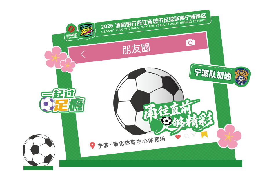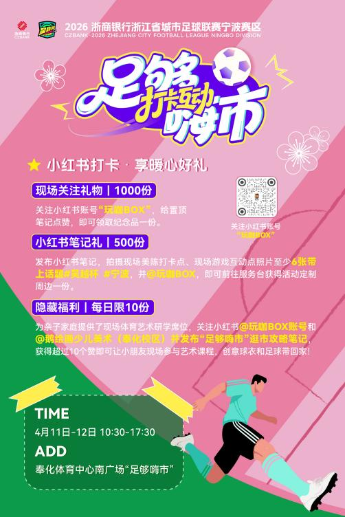 热血足球碰撞市井烟火,一站式潮玩盛宴重磅来袭!2026浙商银行浙江省城市足球联赛宁波赛区配套主题市集—足够嗨市,将于4月11日-12日在奉化体育中心火热开市,以足球为核,串联美食、文创、运动、演艺、研学,打造观赛、逛集、打卡、消费沉浸式新体验,激活城市消费新动能。