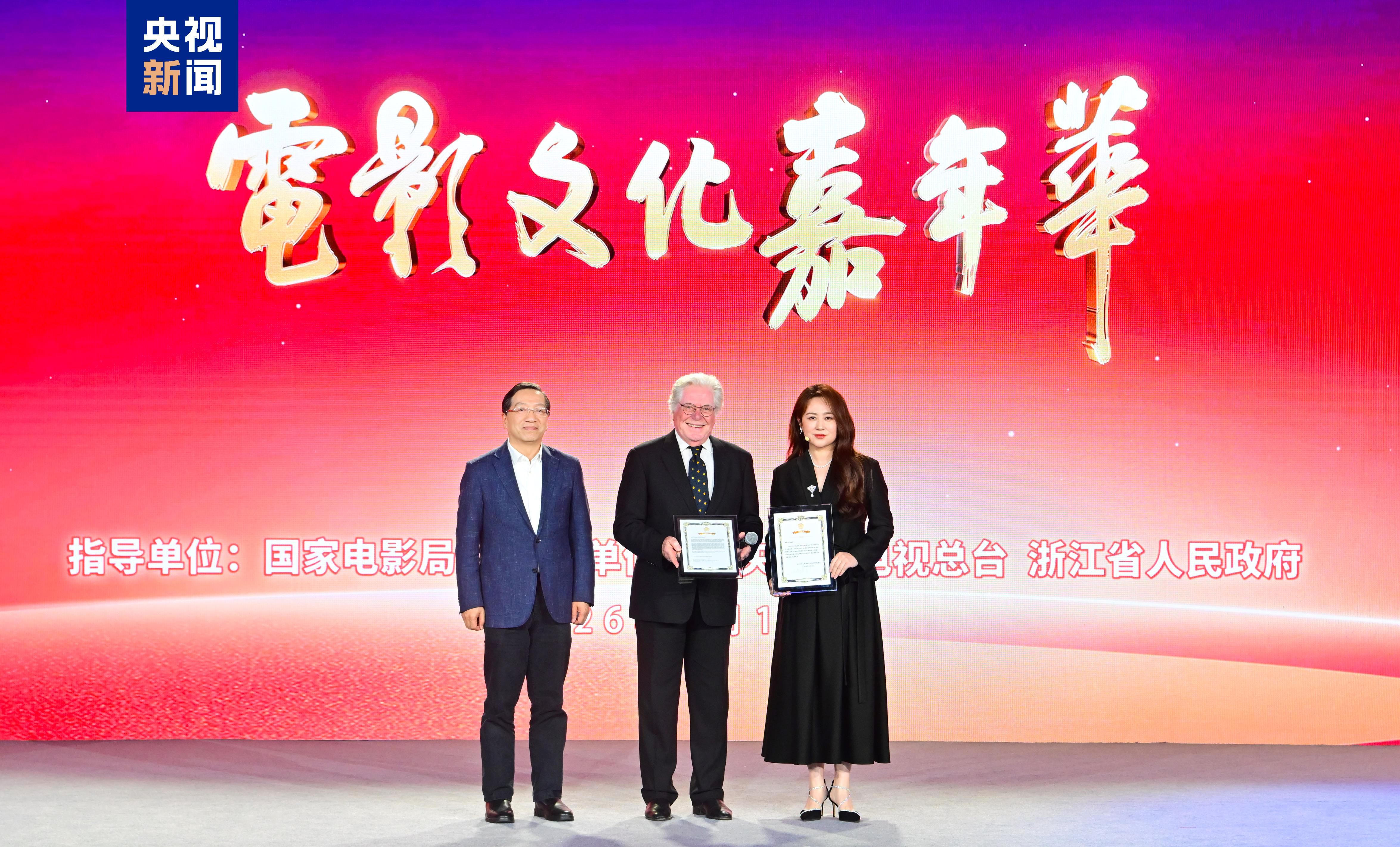 活动现场,演员靳东、王学圻、刘烨、马丽、王志飞获颁“电影文化推广大使”证书。他们表示,将用实际行动和更多优秀作品,用心用情讲好中国故事,为中国电影文化传播尽一份责任与力量。