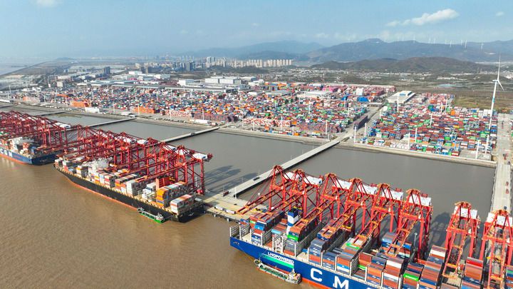 报道了在位于东海之滨的宁波舟山港梅山港区,万吨巨轮沿着岸线在泊位上首尾相连,远控桥吊精准抓取集装箱完成装卸。今年一季度,梅山港区完成集装箱吞吐量创下历史同期最高纪录。作为全球年货物吞吐量第一大港,宁波舟山港的高效运行,为变乱交织的世界注入确定性和稳定性。