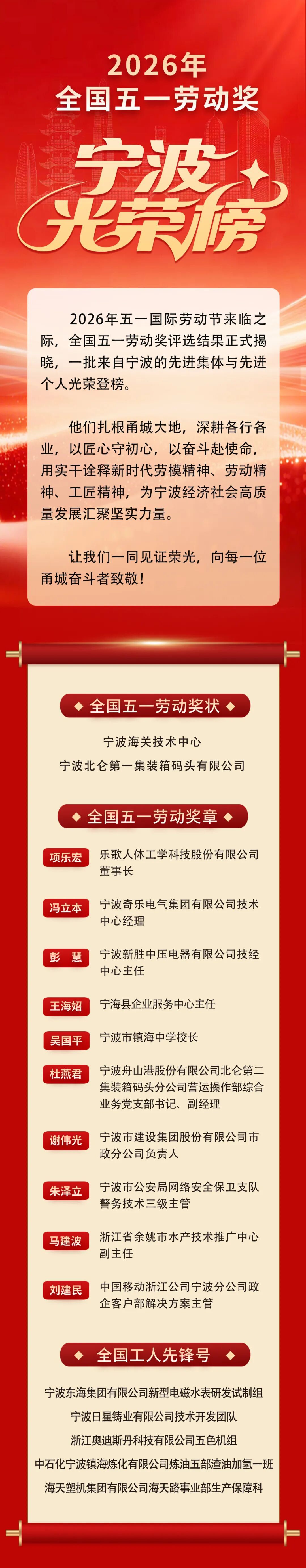 此次受表彰的集体与个人,覆盖先进制造、科技创新、企业服务等多个领域,他们以实干实绩诠释劳动初心,用坚守奉献彰显使命担当,生动展现了新时代宁波劳动者的精神风貌。