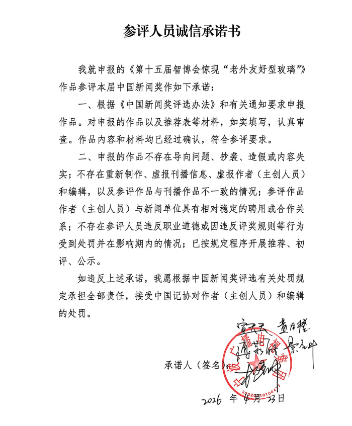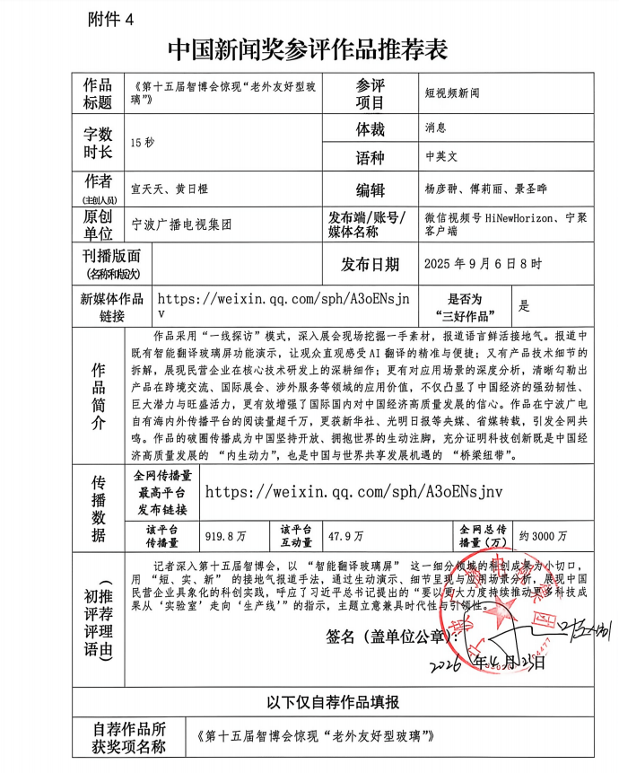 根据《中国新闻奖评选办法》和《第36届中国新闻奖参评作品报送通知》,宁波广播电视集团制作播发的《第十五届智博会惊现“老外友好型玻璃”》拟推荐参加第36届中国新闻奖他荐、自荐作品评选。现将作品相关信息公示,公示期为5个工作日(2026年4月29日-5月8日)。在此期间,如有异议,可通过电话或电子邮件等方式反映。