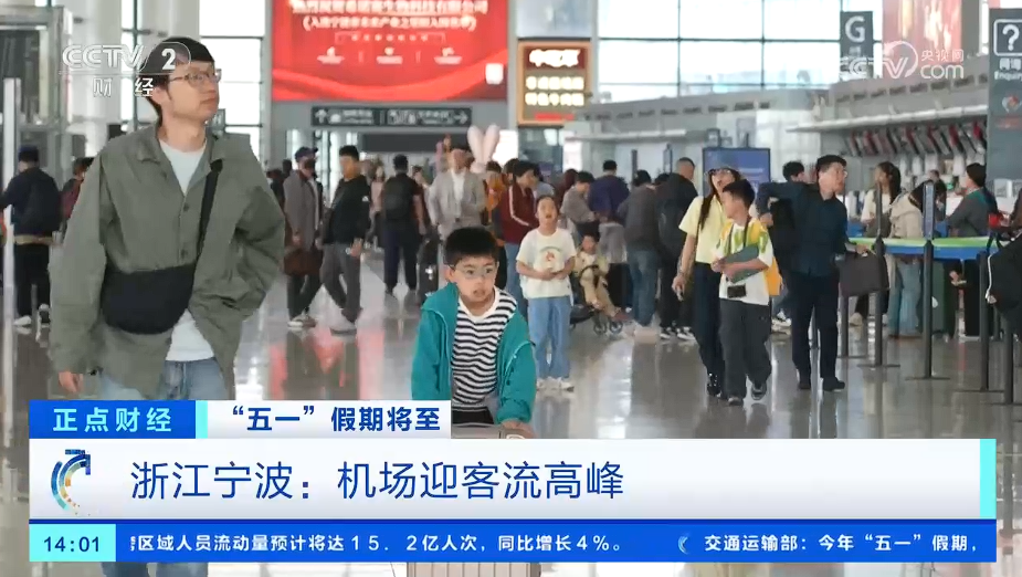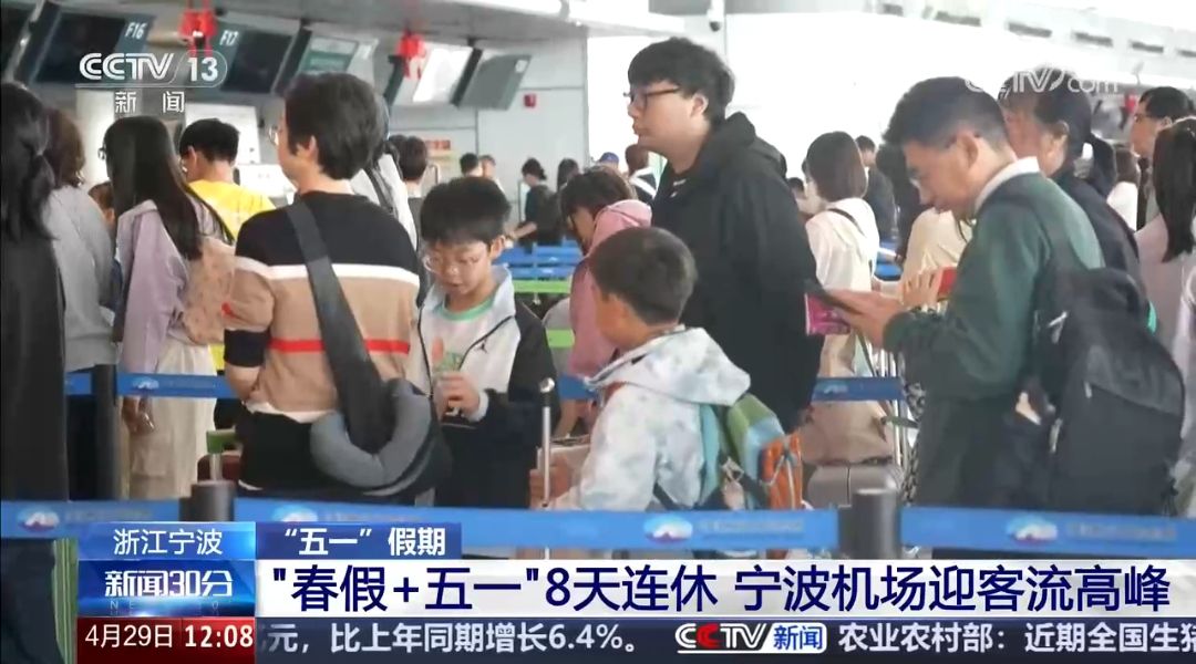今天(4月29日),央视《天下财经》《新闻30分》《正点财经》栏目播出《“五一”假期将至 浙江宁波:春假叠加“五一”8天连休 机场迎客流高峰》,报道了今年宁波中小学春假与“五一”假期衔接,形成8天假期,家庭出游、亲子度假、出境旅行需求集中释放。昨天是春假的第一天,宁波机场迎来出行客流高峰。