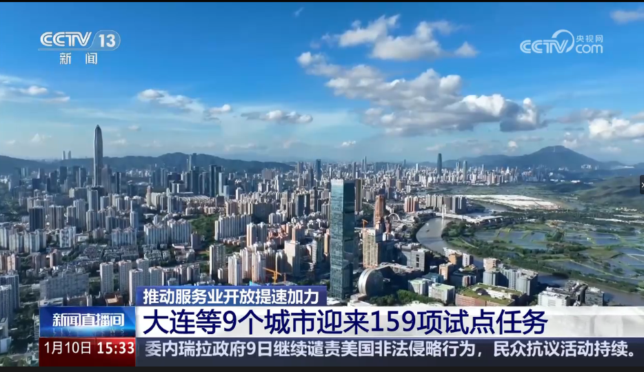 1月10日、11日,央视《新闻30分》《朝闻天下》《新闻直播间》《今日环球》《午夜新闻》栏目播出《推动服务业开放提速加力 大连等9个城市迎来159项试点任务》,报道了近日,商务部印发大连、宁波等9城市服务业扩大开放综合试点任务,赋予这9个城市159项试点任务。试点任务聚焦15类重点工作,包括支持电信服务及相关数字产业开放发展,提高医疗康养领域对外开放和服务保障水平,推进金融领域国际合作,增强商贸文旅领域创新活力等。