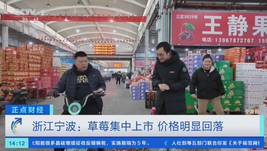 1月14日,央视《天下财经》《正点财经》栏目播出《浙江宁波:草莓集中上市 价格明显回落》,报道了在宁波果品批发市场,草莓销售已进入旺季。与上市初期相比,目前无论是本地还是外地草莓,价格都显得亲民不少。