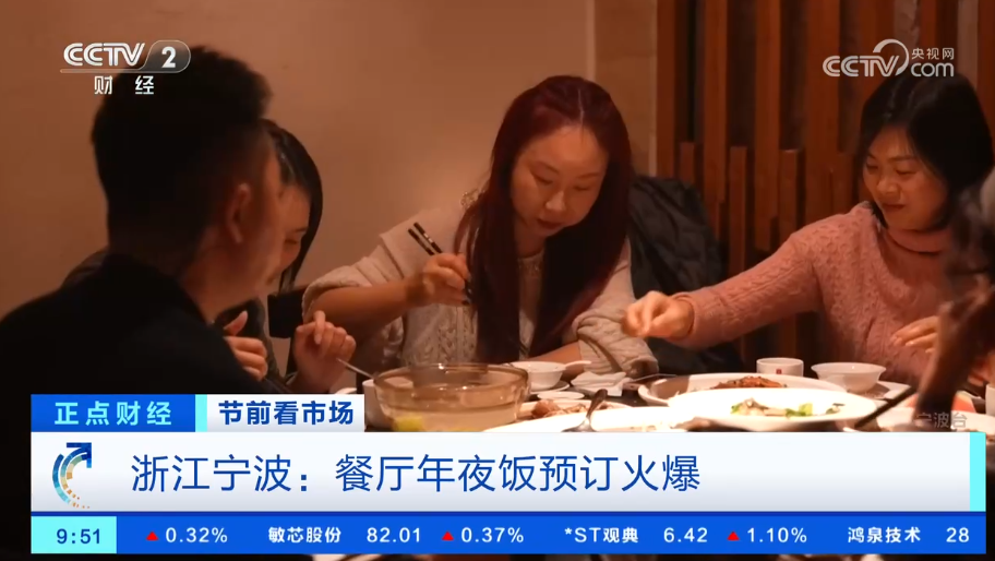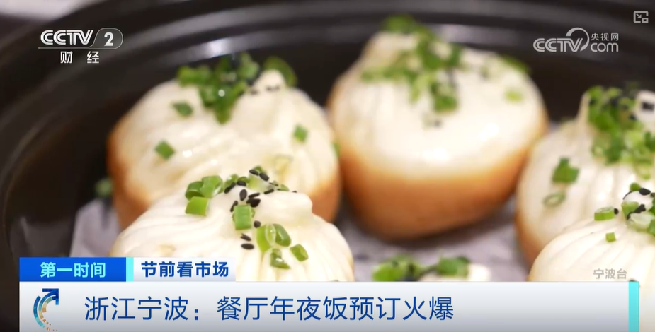 1月13日,央视《正点财经》《第一时间》栏目播出《浙江宁波:餐厅年夜饭预订火爆》,报道了春节临近,宁波不少餐厅的年夜饭预订紧俏,热门包间已被订完。与此同时,为满足更多家庭的用餐需求,一些餐厅也首次推行“分时段”就餐方式,有效分流高峰时段的压力。