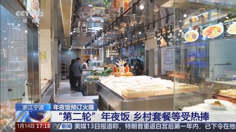 1月14日,央视《新闻直播间》《午夜新闻》栏目播出《年夜饭预订火爆 浙江宁波 “第二轮”年夜饭 乡村套餐等受热捧》,报道了近日,宁波市的热门餐厅年夜饭包厢预订已经接近饱和。与此同时,错峰用餐“第二轮”年夜饭,以及乡村特色年夜饭正在悄然兴起,成为春节消费的新选择。